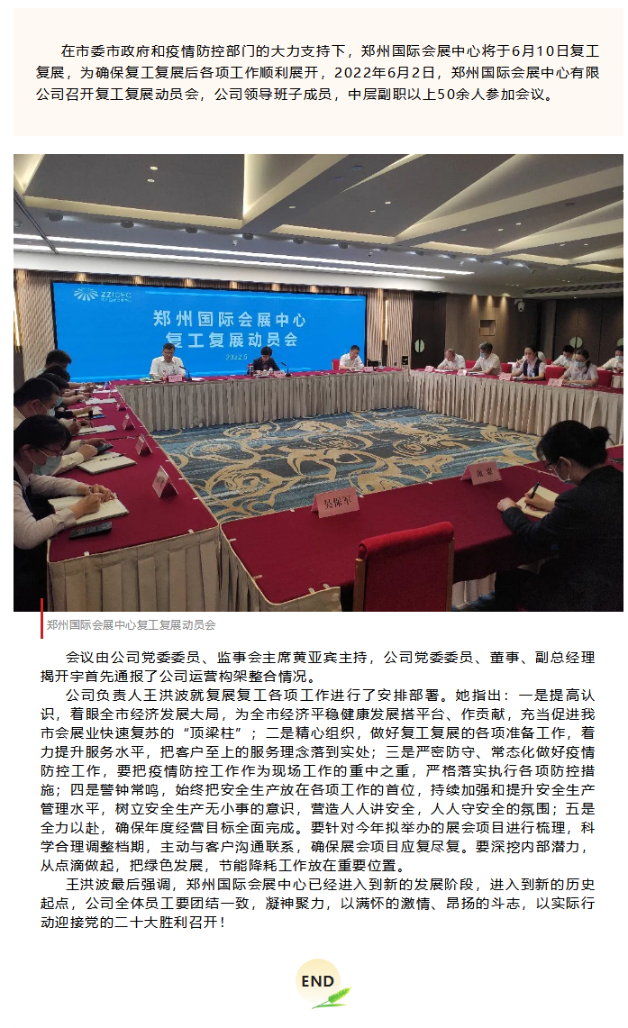 首页新闻中心展会新闻文章详情 文章详情 昂扬斗志、多措并举,积极做好会展中心复工复展工作 在市委市政府和疫情防控部门的大力支持下,郑州国际会展中心将于6月10日复工复展,为确保复工复展后各项工作顺利展开,2022年6月2日,郑州国际会展中心有限公司召开复工复展动员会,公司领导班子成员,中层副职以上50余人参加会议。