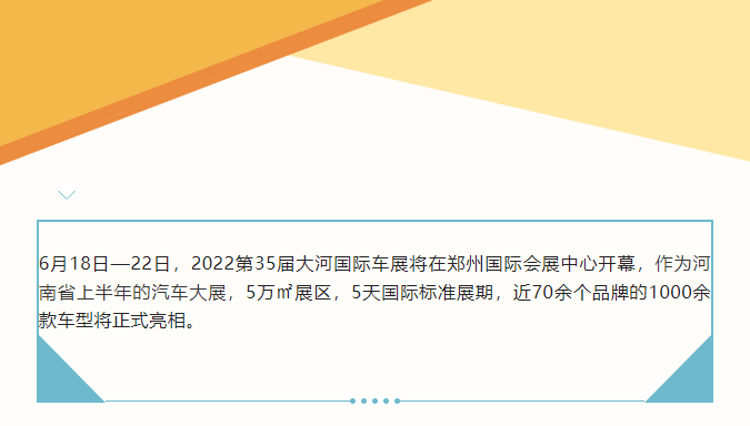 首页新闻中心展会新闻文章详情 文章详情 第35届大河国际车展即将开幕 6月18日—22日,2022第35届大河国际车展将在郑州国际会展中心开幕,作为河南省上半年的汽车大展,5万㎡展区,5天国际标准展期,近70余个品牌的1000余款车型将正式亮相。