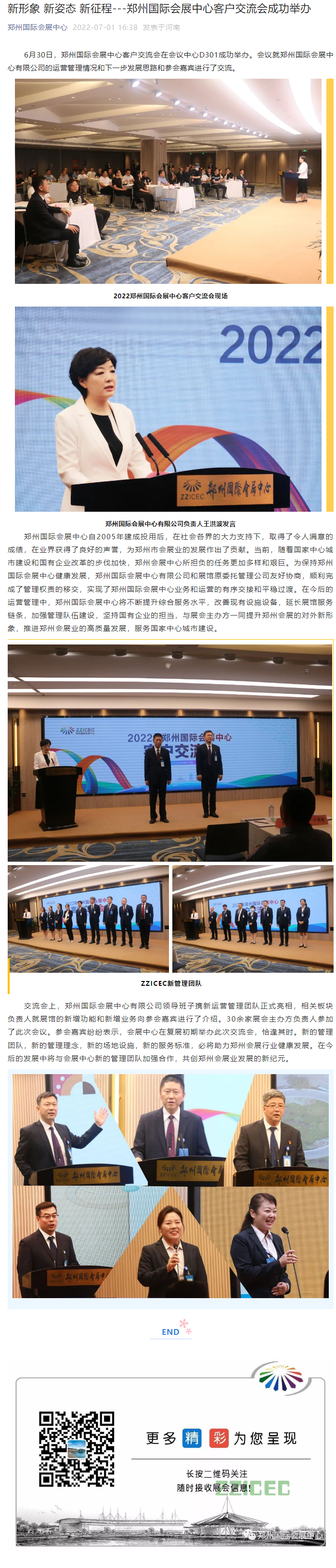 首页新闻中心展会新闻文章详情 文章详情 新形象 新姿态 新征程---郑州国际会展中心客户交流会成功举办 6月30日,郑州国际会展中心客户交流会在会议中心D301成功举办。会议就郑州国际会展中心有限公司的运营管理情况和下一步发展思路和参会嘉宾进行了交流。