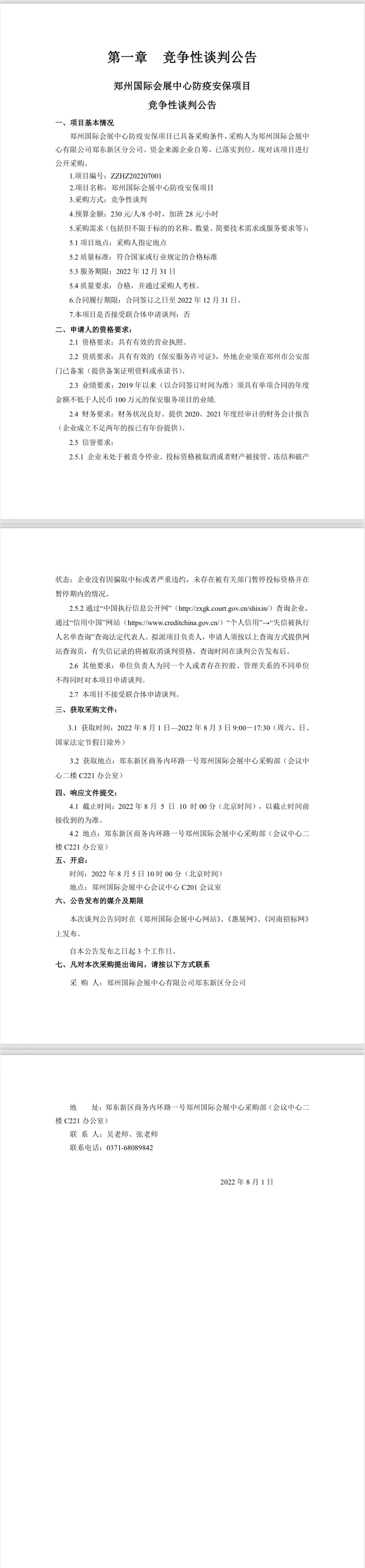 郑州国际会展中心防疫安保项目 竞争性谈判公告