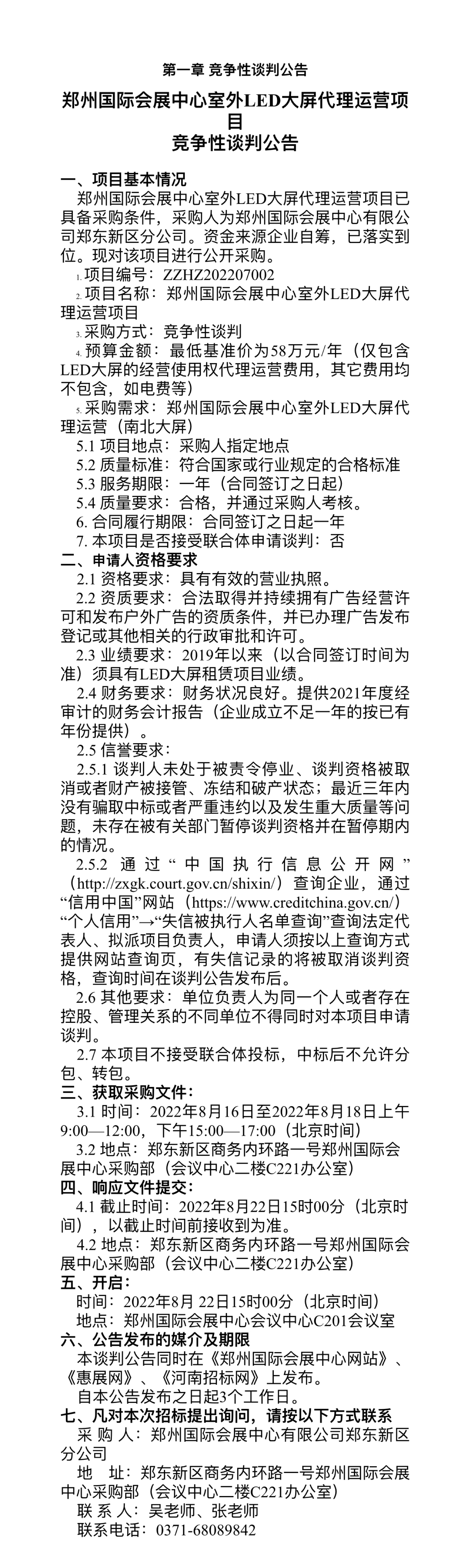 郑州国际会展中心室外LED大屏代理运营项目 竞争性谈判公告
