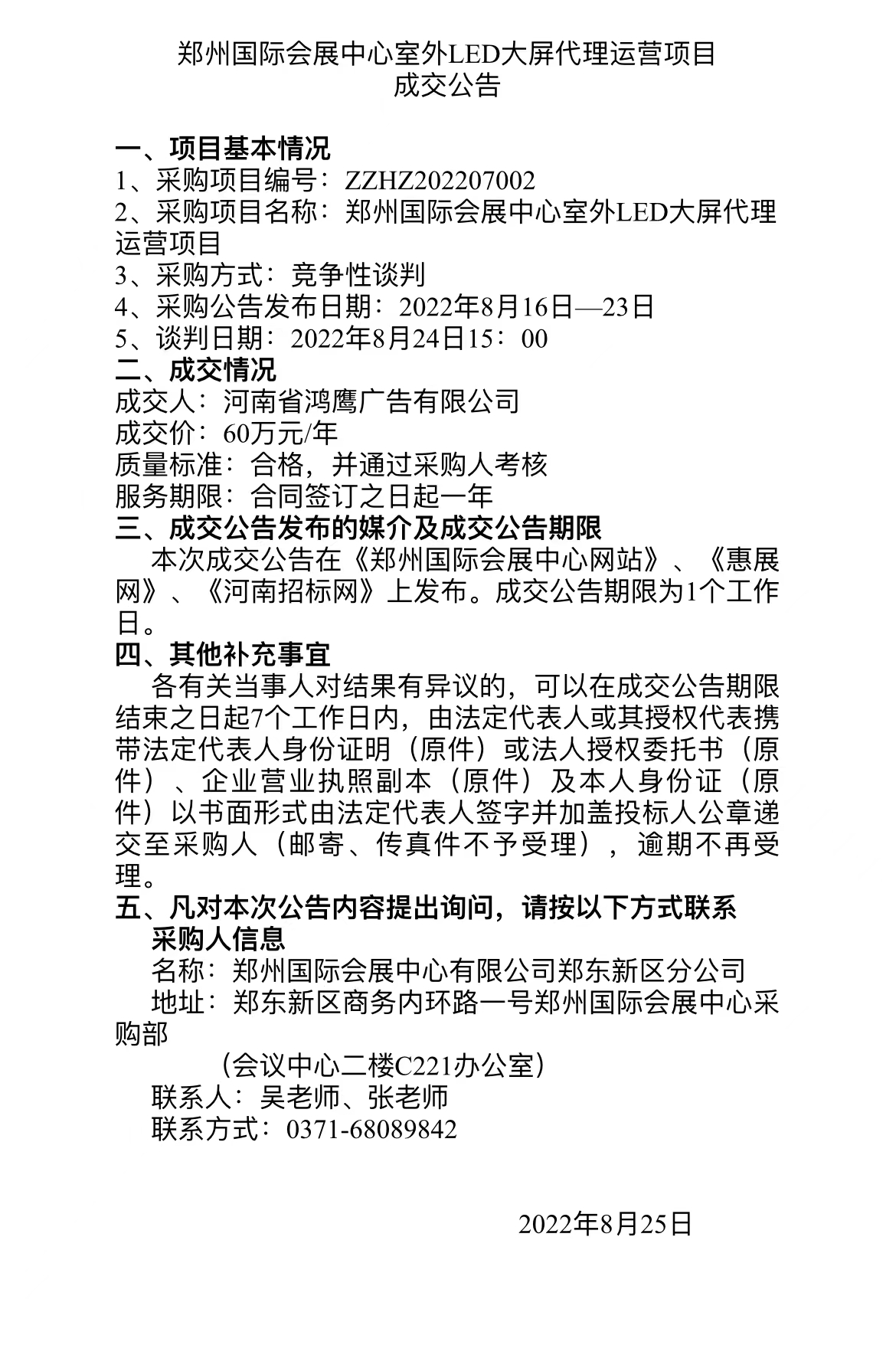郑州国际会展中心室外LED大屏代理运营项目 成交公告