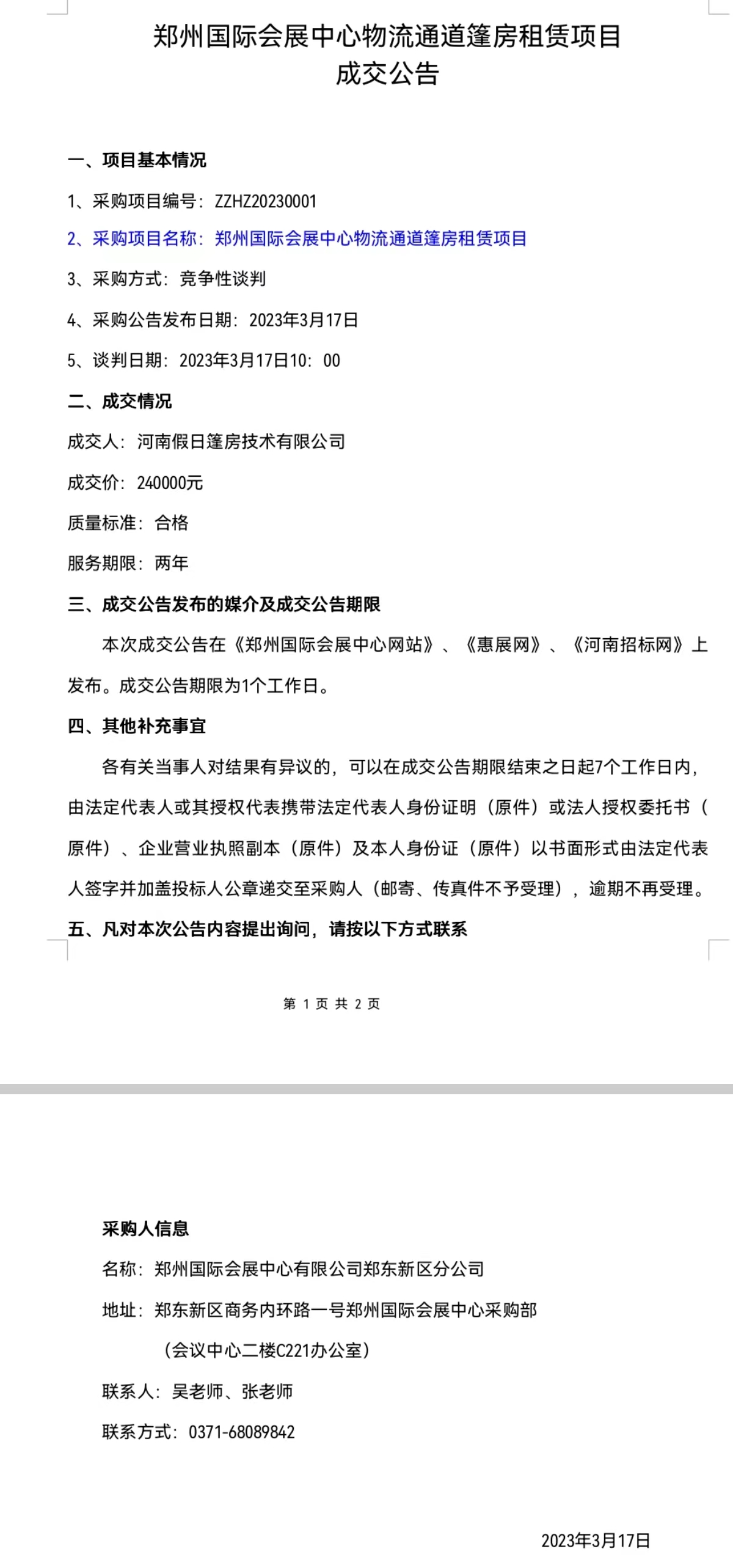 郑州国际会展中心物流通道篷房租赁项目 成交公告