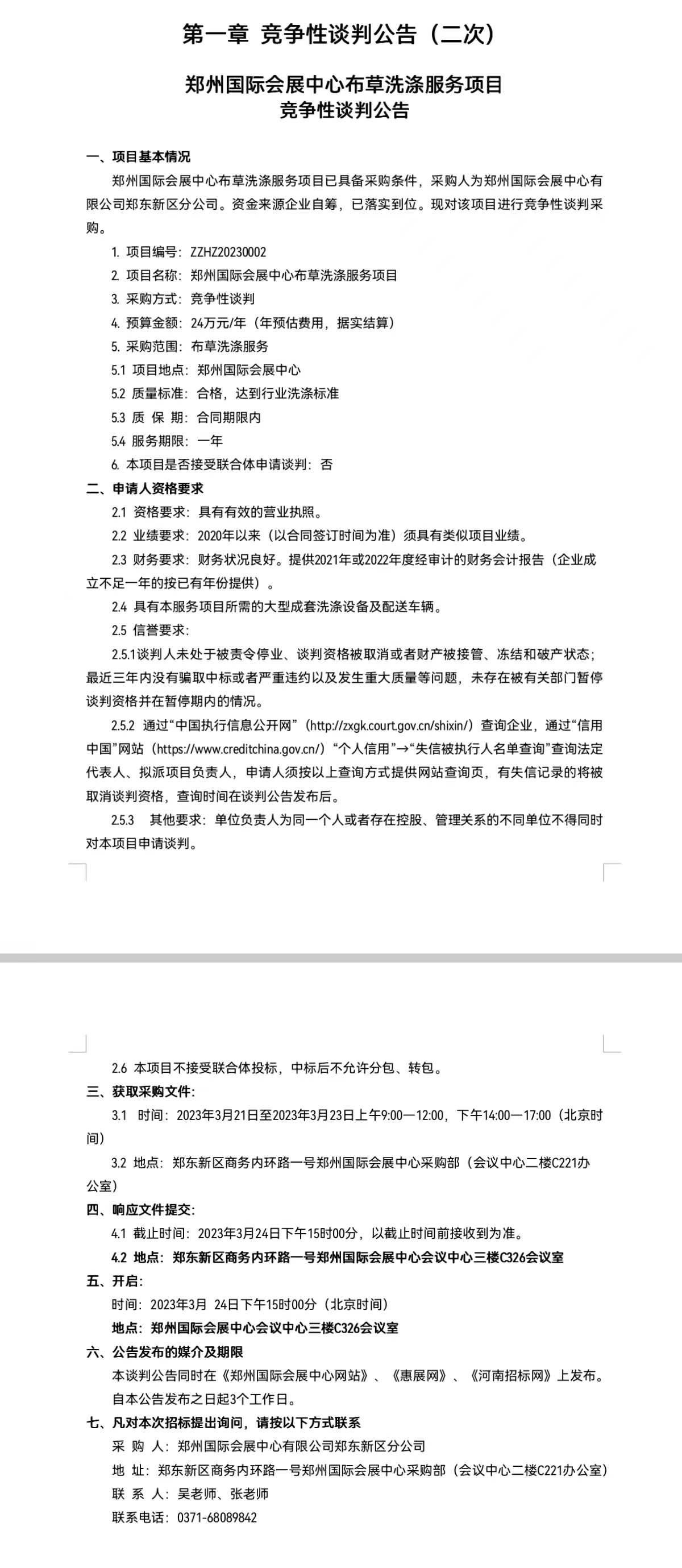 郑州国际会展中心布草洗涤服务项目 竞争性谈判公告(二次)
