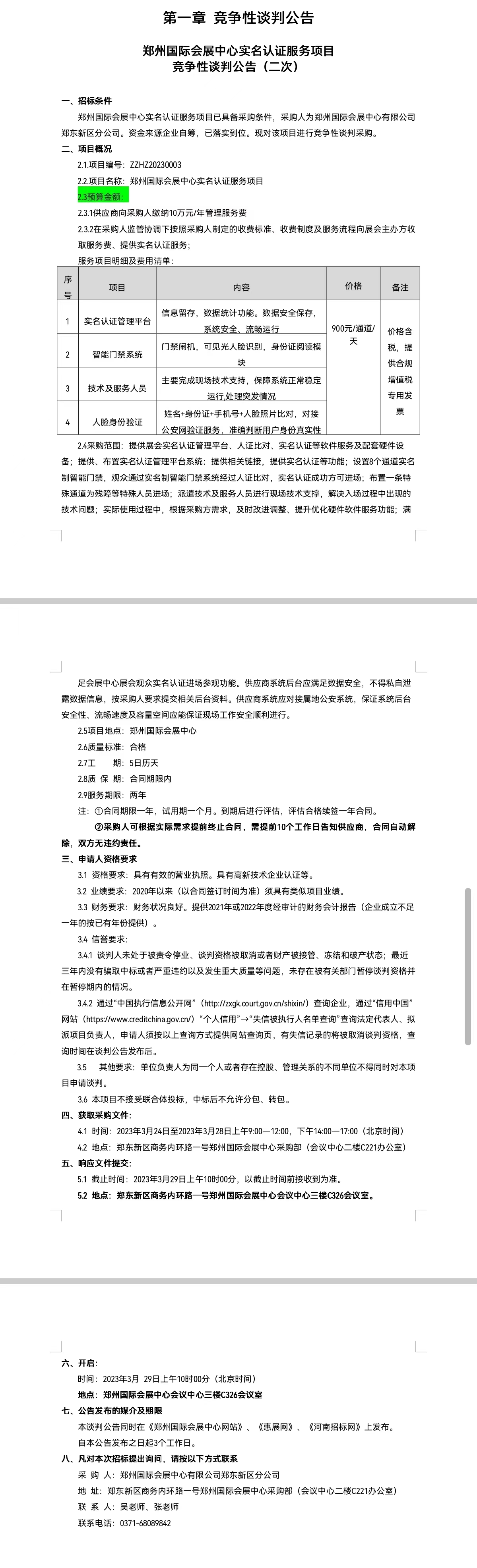 郑州国际会展中心实名认证服务项目 竞争性谈判公告(二次)